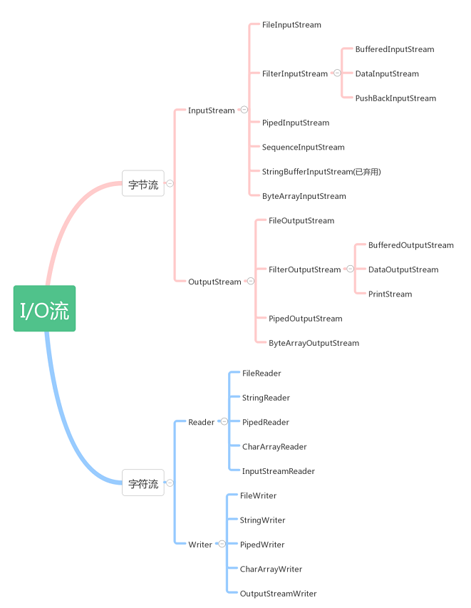 按照处理数据的单位: 字节流和字符流。分别由四个抽象类来表示(每种流包括输入和输出两种所以一共四个):InputStream,OutputStream,Reader,Writer。Java中其他多种多样变化的流均是由它们派生出来的。