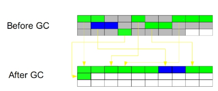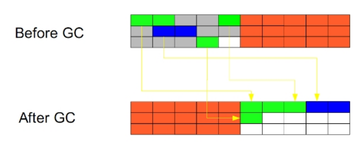 第二步:将所有的存活的对象向一段移动,将端边界以外的对象都回收掉;