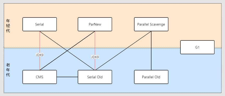 垃圾回收器主要分为以下几种:Serial、ParNew、Parallel Scavenge、Serial Old、Parallel Old、CMS、G1;