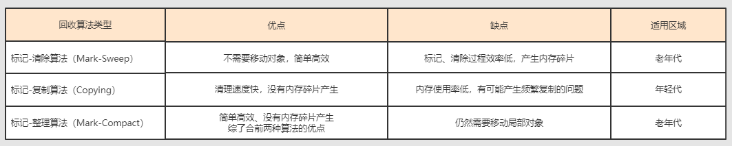 特点:效率不行,标记和清除的效率都不高;标记和清除后会产生大量的不连续的空间分片,可能会导致之后程序运行的时候需分配大对象而找不到连续分片而不得不触发一次GC;