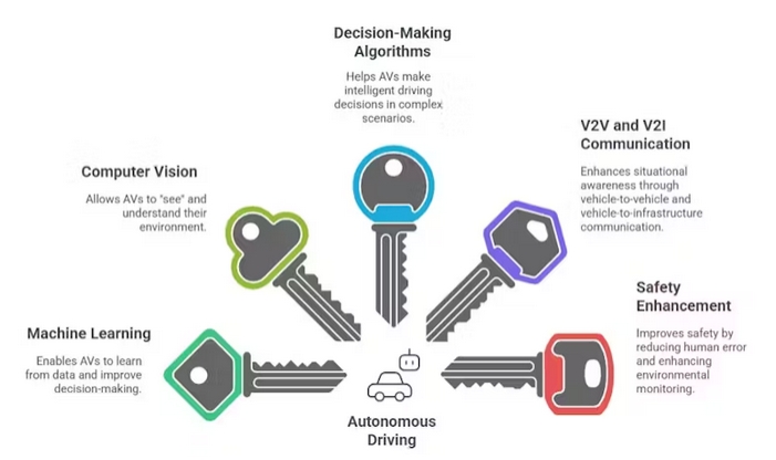 自动驾驶汽车(AVs)的研发与运营在很大程度上得益于人工智能(AI),它使自动驾驶汽车能够执行通常需人类驾驶员完成的复杂任务。自动驾驶的核心在于车辆能够感知环境、实时决策,并在无需人为干预的情况下依据决策采取行动。正是多种人工智能驱动技术的结合,使得自动驾驶汽车能够处理海量传感数据、积累经验并不断提升决策能力,从而实现自主运行。人工智能不仅是车辆运行智能的基础,还承担着持续提高安全性、有效性及对变化条件适应性的责任。