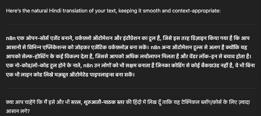 示例:请将以下内容翻译成印地语,确保译文语言自然流畅,且符合原文语境:n8n是一款开源的代理构建、工作流自动化和集成工具,旨在帮助你连接应用程序并构建代理式工作流程。n8n与其他自动化工具不同,因为它提供了多种自行托管的选项,这使得更具灵活性并避免了供应商锁定。作为一款无代码/低代码工具,n8n使没有编程背景的人能够无需编写一行代码就构建强大的自动化管道。