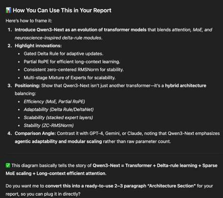 示例:请分析以下图像(图像描述:“一张包含Qwen3-Next模型架构的示意图,标注了输入层、编码层、解码层及输出层的核心模块”),先对图像内容进行完整描述,提炼关键信息要点,再说明如何将这些信息用于“关于Qwen3-Next的技术报告”。