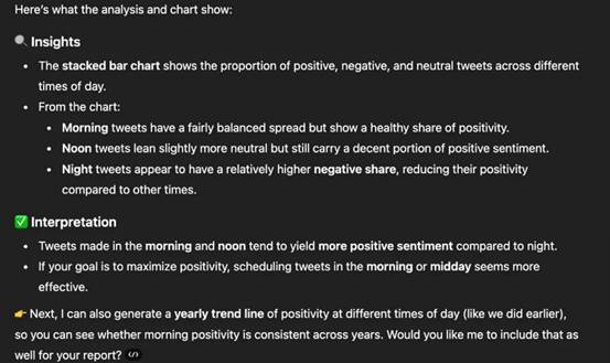 示例:我拥有一份关于“各类推文情感分析”的数据集,包含推文内容、发布时间、情感标签等维度。请指导我如何分析该数据集以找出“推文产生积极情感的时间规律”,并提供用于实现“时间规律可视化”的Python代码及图表类型建议,同时附上相关操作解释。