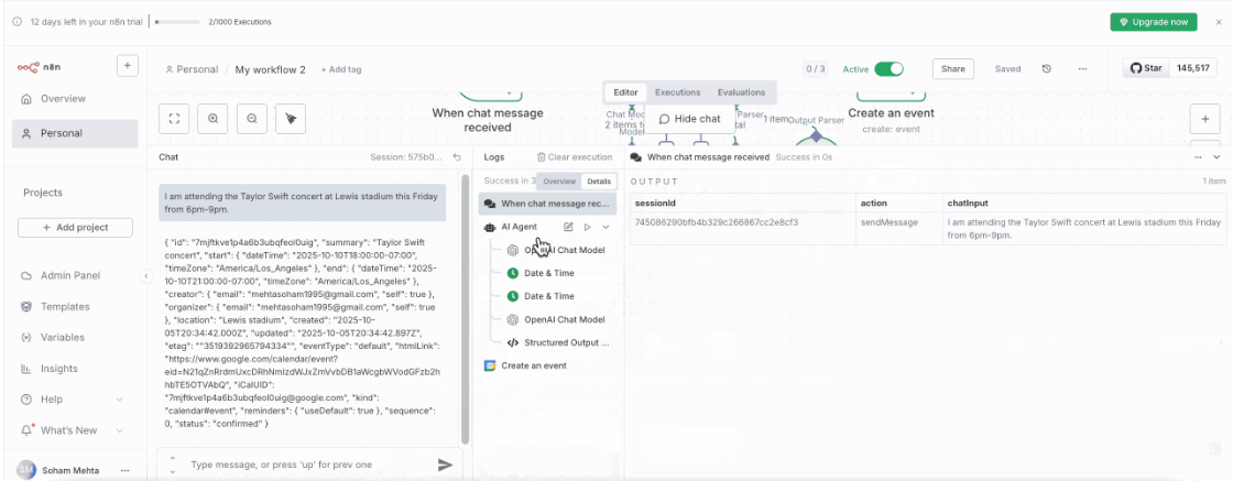 大功告成!现在已成功构建一个由人工智能驱动的自动化工作流,能够根据聊天消息在Google日历中创建事件。你可通过界面顶部的开关激活该工作流,点击“打开聊天”按钮即可启动对话并发送测试消息。工作流程执行过程中,可实时查看各节点的输入与输出状态。