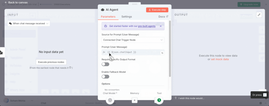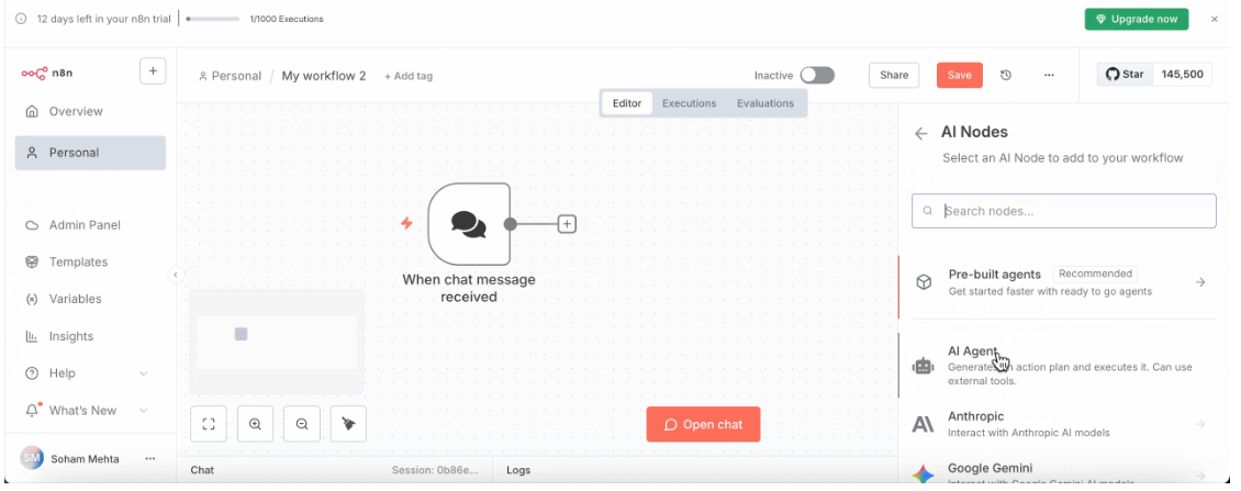 现在进入核心构建环节:创建一个能够监听聊天消息、通过AI智能体解析用户请求,并自动在Google日历中创建事件的工作流。该流程将展示 n8n 平台在人工智能驱动自动化任务中的能力。