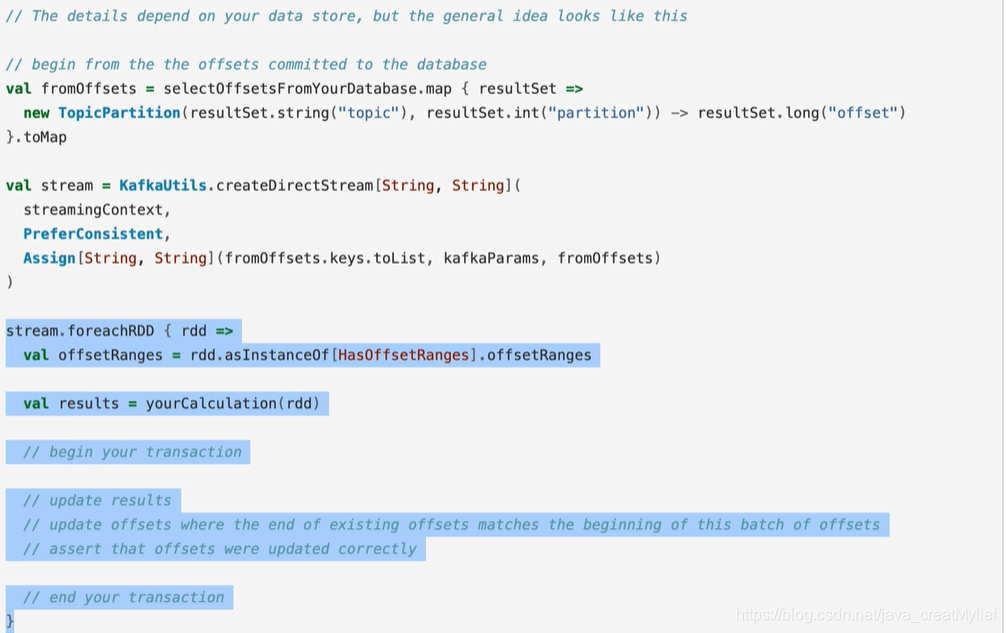 // 获取偏移量,为什么偏移量是个array呢???,因为dstram里也是多个kafkardd,一个kafkardd对应一个offsetRange