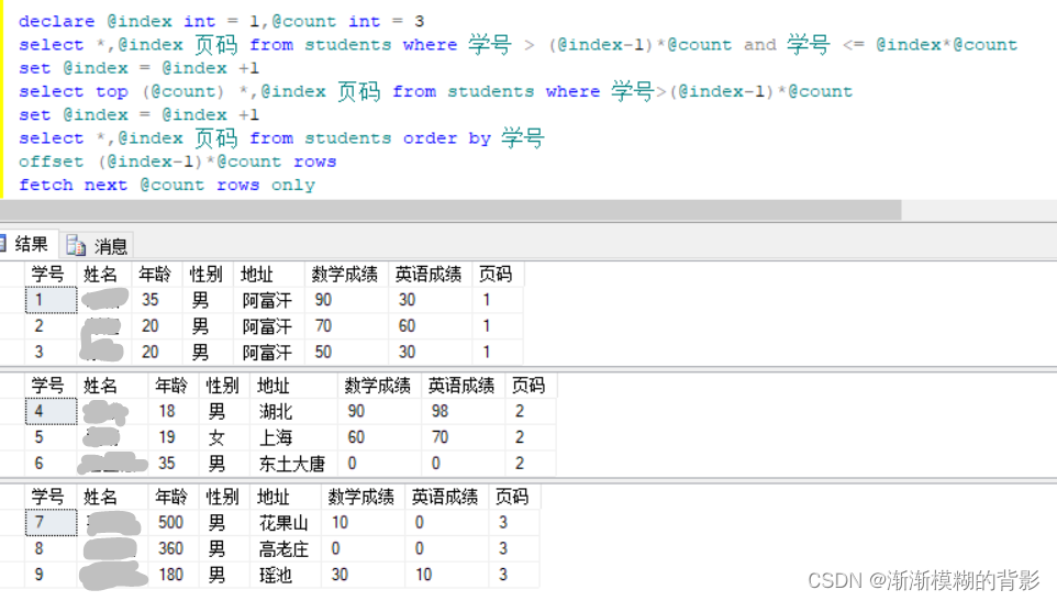 select top @count *,@index 页码 from students where 学号>(@index-1)*@count