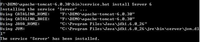 F:\DEMO\apache-tomcat-6.0.30\bin>service.bat install Server6