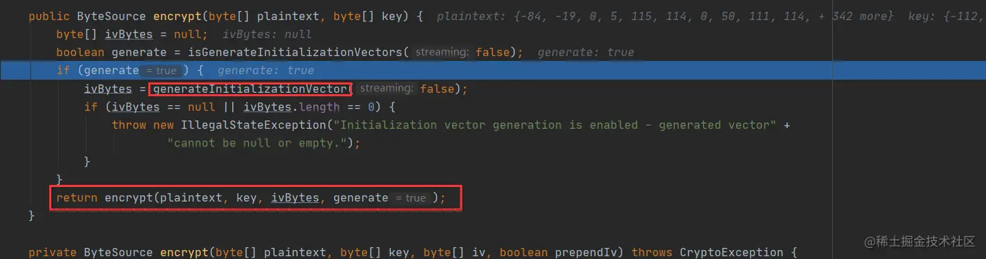 查看到这里发现会传入前面序列化的数组和key值,最后再去调用他的重载方法并且传入序列化数组、key、ivBytes值、generate。