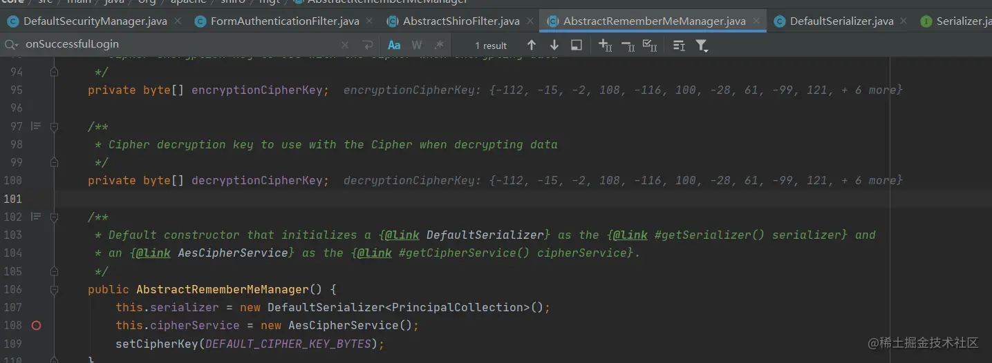 现在已经知道了是因为获取rememberMe值,然后进行解密后再进行反序列化操作。