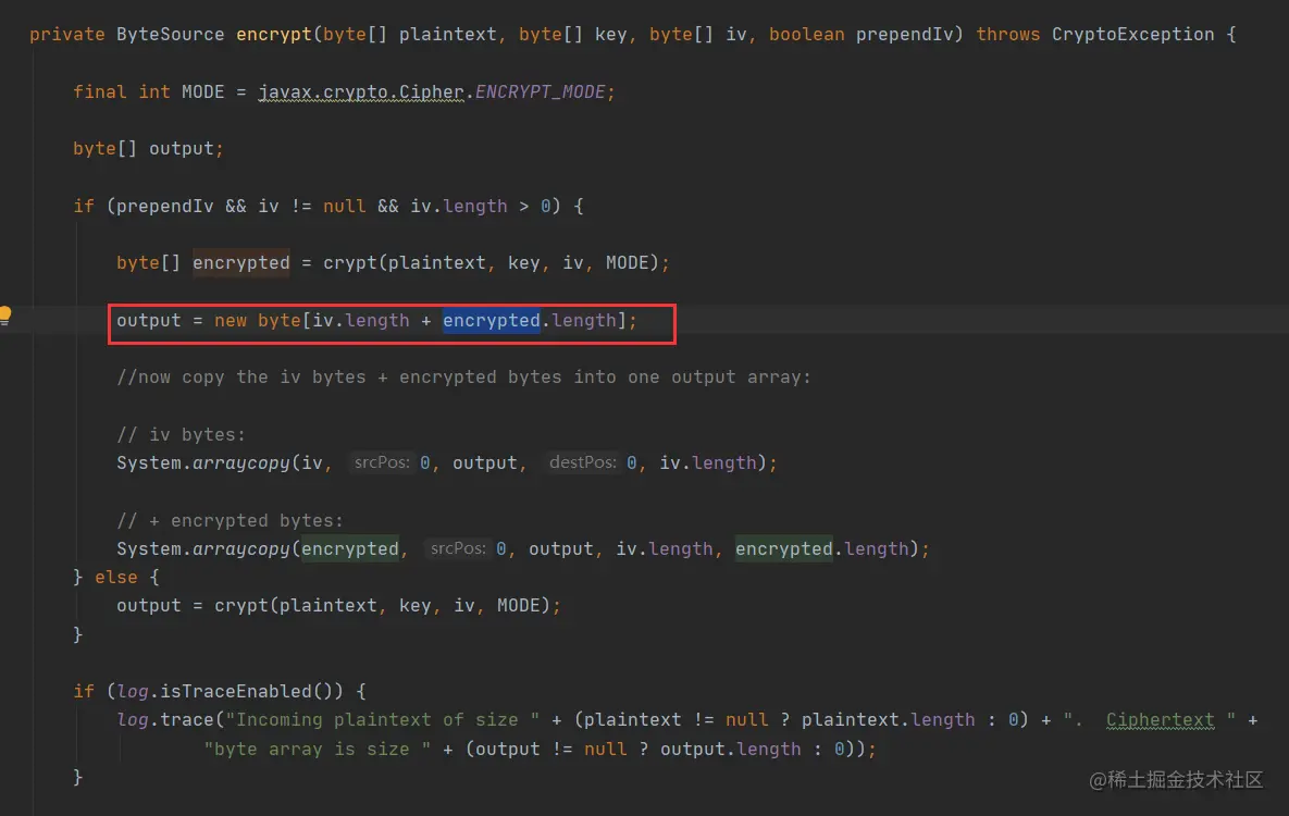 这里调用crypt方法进行获取到加密后的数据,而这个output是一个byte数组,大小是加密后数据的长度加上iv这个值的长度。