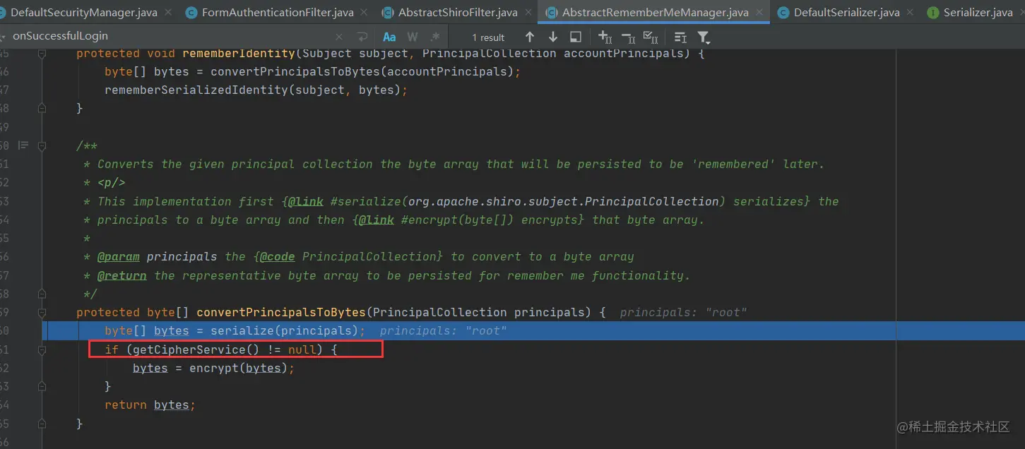 当登录成功后会调用AbstractRememberMeManager.onSuccessfulLogin方法,该方法主要实现了生成加密的RememberMe Cookie,然后将RememberMe Cookie设置为用户的Cookie值。在前面我们分析的rememberSerializedIdentity方法里面去实现了