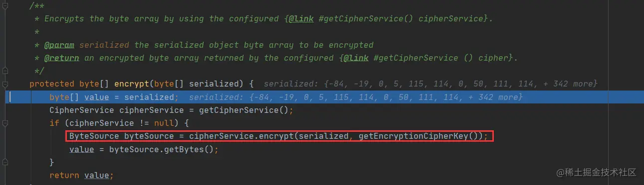 这里调用了cipherService.encrypt方法并且传入序列化数据,和getEncryptionCipherKey方法。