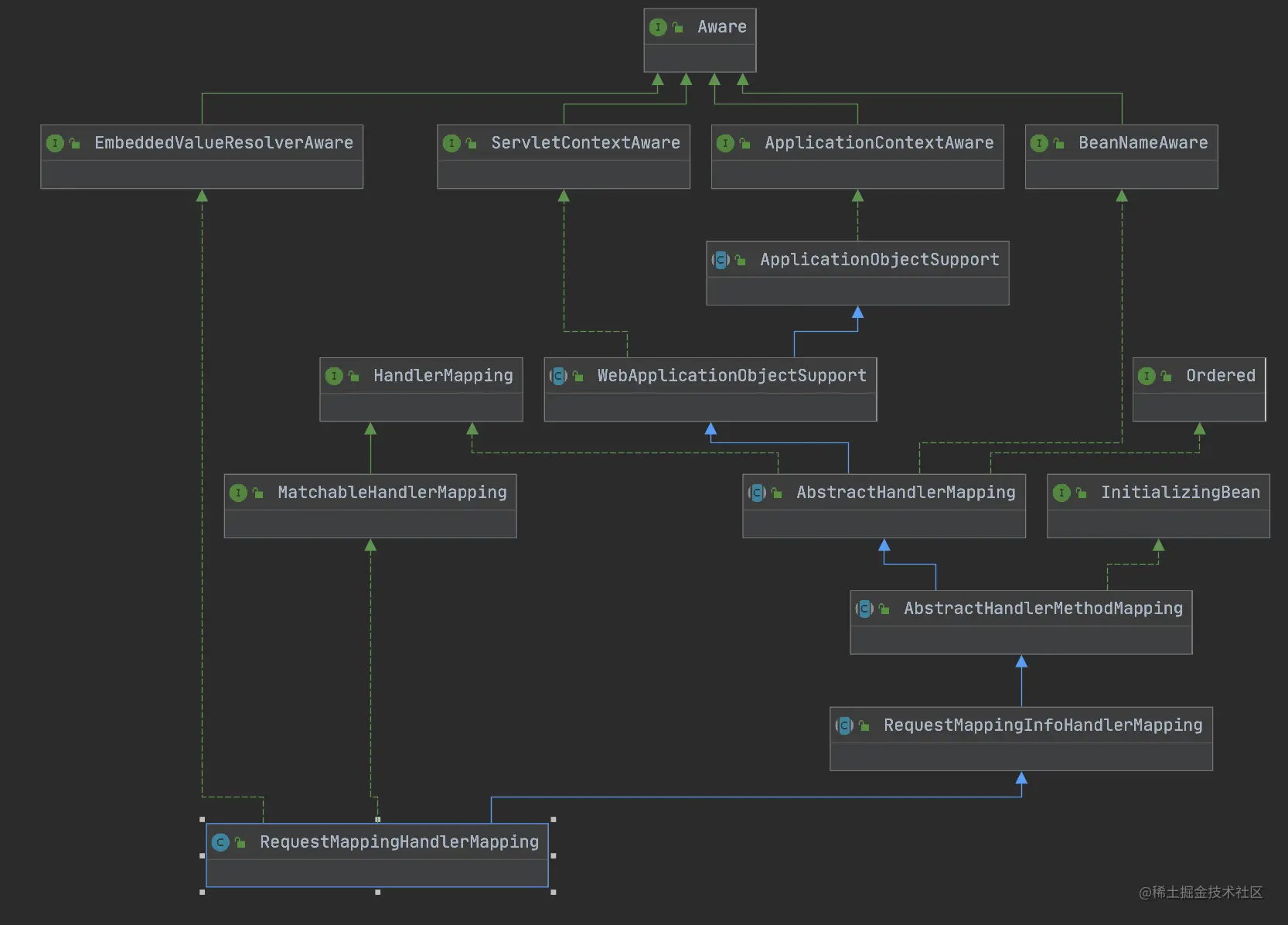 RequestMappingHandlerMapping:完成@Controller和@RequestMapping的解析,并将解析保存。请求发送时与请求路径进行匹配对应找到合适的Handler。RequestMappingHandlerMapping实现了InitializingBean接口,会在afterPropertiesSet方法中。- 调用时机: 解析