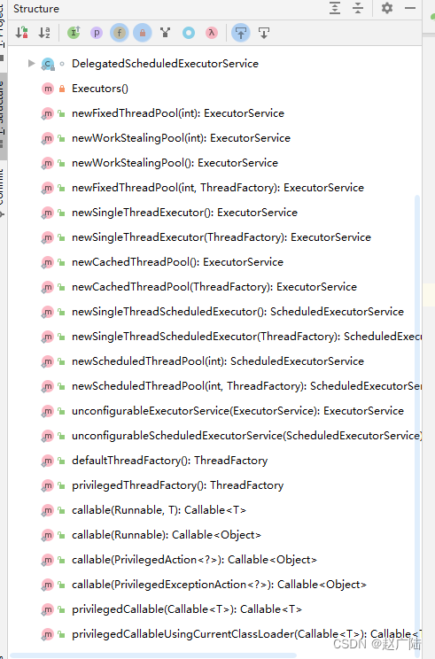 在idea中,把光标放到Executors上,按住鼠标左键+ctrl进入Executors类。输入alt+7查看该类下的所有方法。