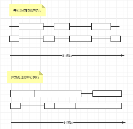 如果 CPU 只有一个,那么并发处理就是顺序执行的,而如果有多个 CPU,那么并发处理就可能会并行运行。