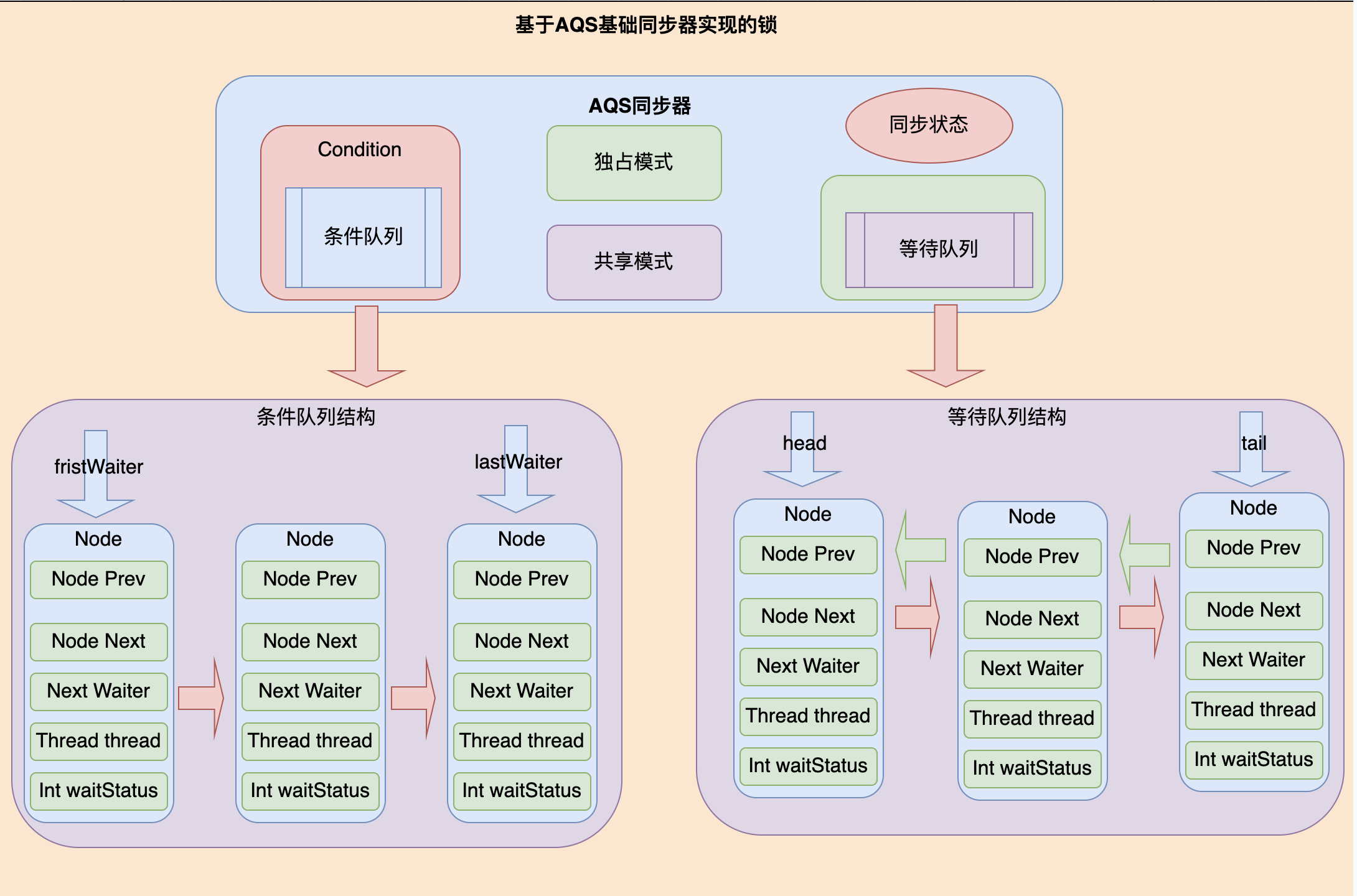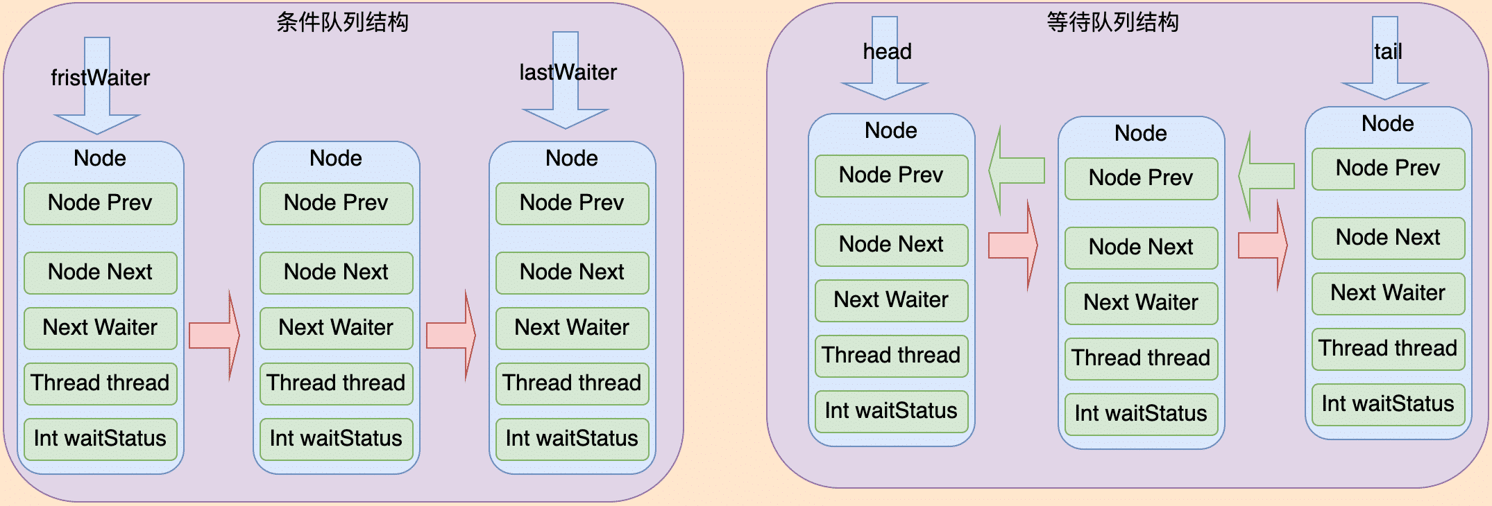 - 维护了一个状态工作模式标记: 主要是维护了一个nextWaiter,用于表示在等待队列中当前节点在是共享模式还是独享模式,而对于条件队列来说,用于组成单向链表结构
