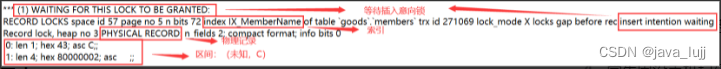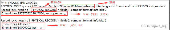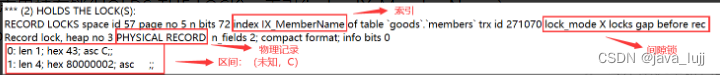 查看事务T2日志里持有锁(HOLDS THE LOCK):索引(index IX_MemberName),间隙锁(lock_mode X locks gap before rec),物理记录(PHYSICAL RECORD),间隙区间(未知,C)。