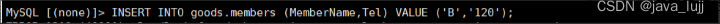 INSERT INTO goods.members (MemberName,Tel) VALUE ('B','120');