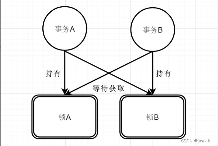 因此我们举个例子来描述,如果此时有一个事务A,先持有锁A,再去获得锁B的情况下,同时又有一个事务B,先持有锁B再去获得锁A的时候就会发生死锁。