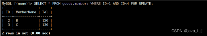 SELECT * FROM goods.members WHERE ID>1 AND ID<4 FOR UPDATE;