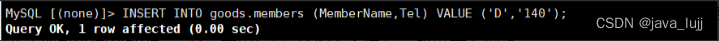 INSERT INTO goods.members (MemberName,Tel) VALUE ('D','140')