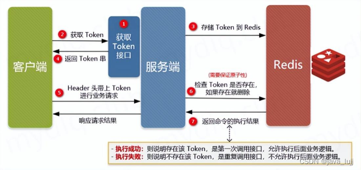 后端需要对这个 Token 作为 Key,用户信息作为 Value 到 Redis 中进行键值内容校验,如果 Key 存在且 Value 匹配就执行删除命令,然后正常执行后面的业务逻辑。