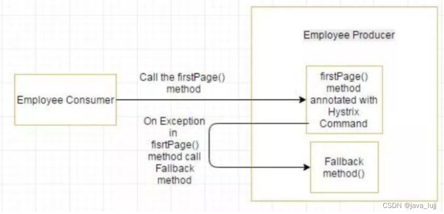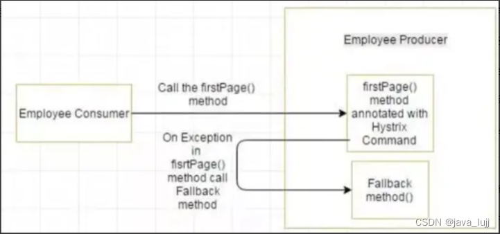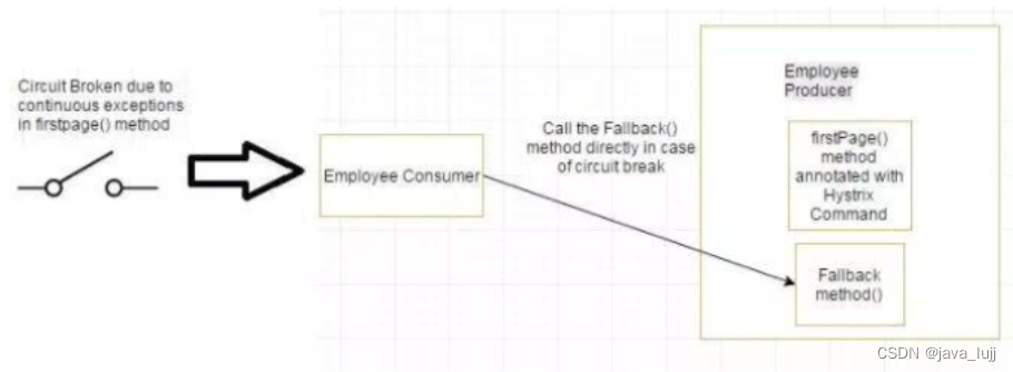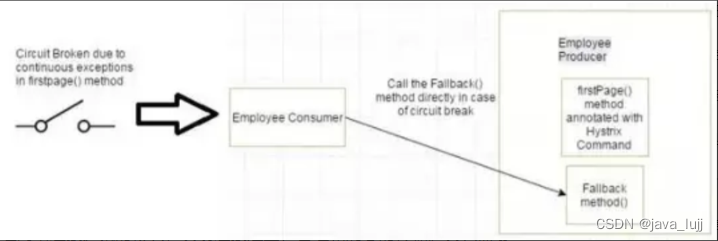 如果firstPage method()中的异常继续发生,则Hystrix电路将中断,并且员工使用者将一起跳过firtsPage方法,并直接调用回退方法。断路器的目的是给第一页方法或第一页方法可能调用的其他方法留出时间,并导致异常恢复。可能发生的情况是,在负载较小的情况下,导致异常的问题有更好的恢复机会。