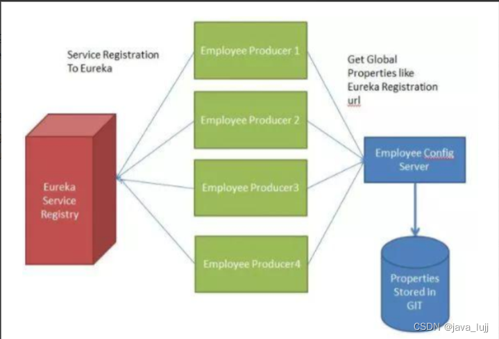 考虑以下情况:我们有多个应用程序使用Spring Cloud Config读取属性,而Spring Cloud Config从GIT读取这些属性。下面的例子中多个员工生产者模块从Employee Config Module获取Eureka注册的财产