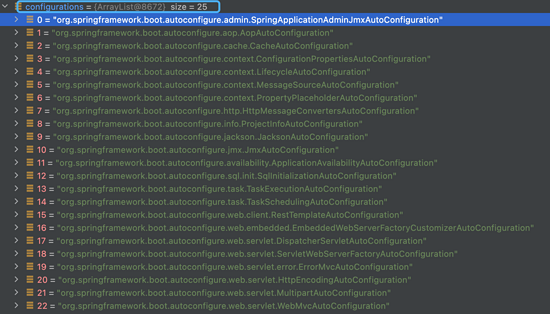 List<String> configurations = SpringFactoriesLoader.loadFactoryNames(getSpringFactoriesLoaderFactoryClass(),