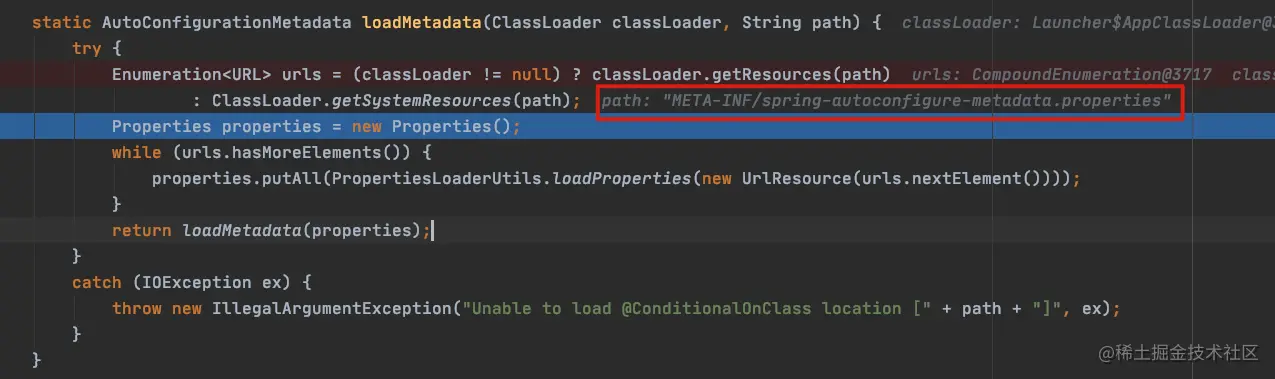 private AutoConfigurationMetadata getAutoConfigurationMetadata() { if (this.autoConfigurationMetadata == null) { this.autoConfigurationMetadata = AutoConfigurationMetadataLoader.loadMetadata(this.beanClassLoader); } return this.autoConfigurationMetadata; }AutoConfigurationMetadataLoader类: