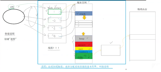 以往创建进程会创建 task_struct,mm_struct,页表等,但如果创建 “进程” 只能创建 task_struct,不能创建 mm_struct,页表等,且创建出来的 task_struct 和父进程共享进程地址空间,页表等,这些"进程"被称作线程