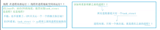 在Linux中,站在CPU的角度,不能识别 task_struct 是进程还是线程,因为CPU只关心一个一个的独立执行流