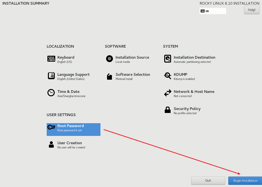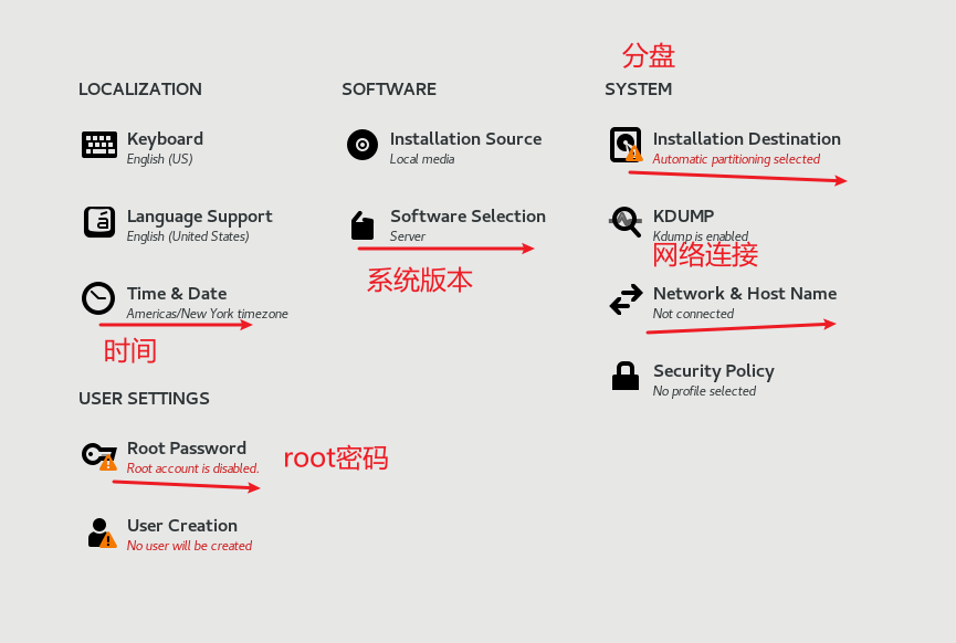我们设置5部分 分别是时间,系统版本,网络连接,分盘 和root密码