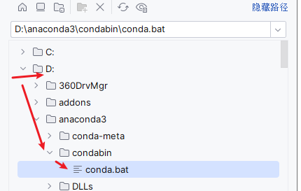 如果右边的 conda 可执行文件的路径, 没有出现进行 路径查找