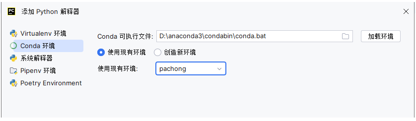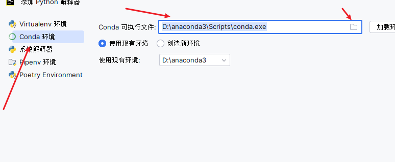 先选择左边的conda环境, conda 可执行文件的路径,点击 加载环境