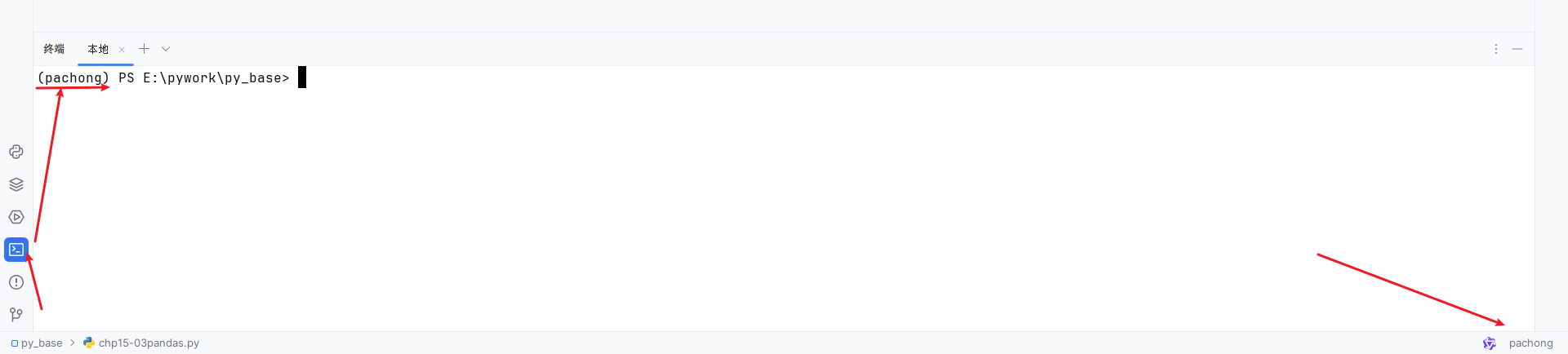 右下角出现 pachong 环境名字,点击左侧终端 出现 (pachong) 说明配置成功