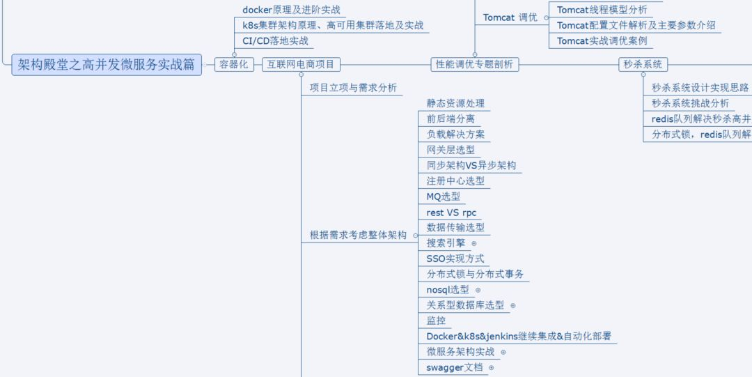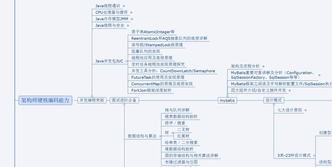 这里搜集了 62 套阿里、腾讯、美团、网易等公司 近两年的面试题,把技术点梳理成一份大而全的“ Java高级架构师”面试 Xmind,包含知识脉络 + 分支细节,由于篇幅有限,这里以图片的形式给大家展示一部分(压缩成图片也有18M,实在不咋会整张上传)。