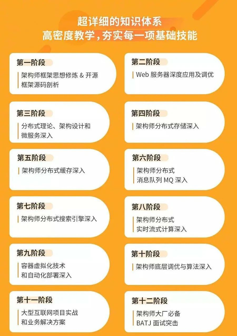 目标清晰:终极目标是达到阿里P7水平,整个学习期为6个月,共分为12个阶段,每个阶段都会有清晰的目标;