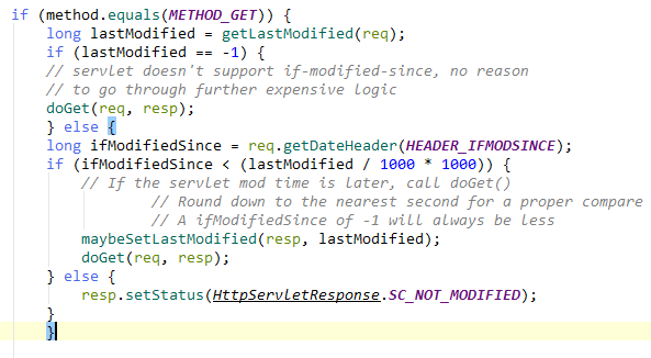 先别沮丧,忘了我们要解释什么问题吗——为什么不要重写service方法。也许你已经猜到了,如果你看看service方法的实现,现在你已经明白了,service方法自己实现了缓存协商的机制,如果我们重写它,反而将这中良好的机制给去掉了。