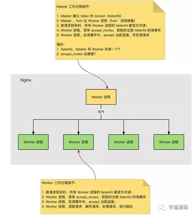 Nginx 是多进程模型,Worker 进程用于处理请求。