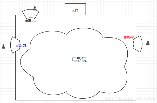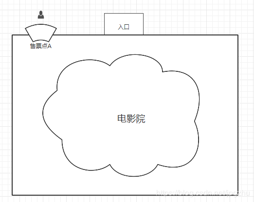 我们设定有一个电影院,该电影院开张不久,在入口的旁边只设立了一个售票点A,顾客看电影,需要在售票点排队依次买票,买完票后在入口处检票进入电影院观影。