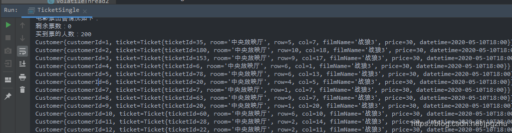 System.out.println("总共票数:" + ROW * COL + ",剩余票数:" + tickets.size());