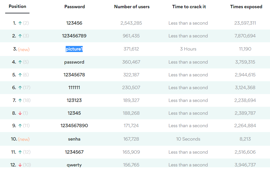 前12名的分别为:123456、123456789、picture1、password、12345678、111111、123123、12345、1234567890、senha、1234567、qwerty。