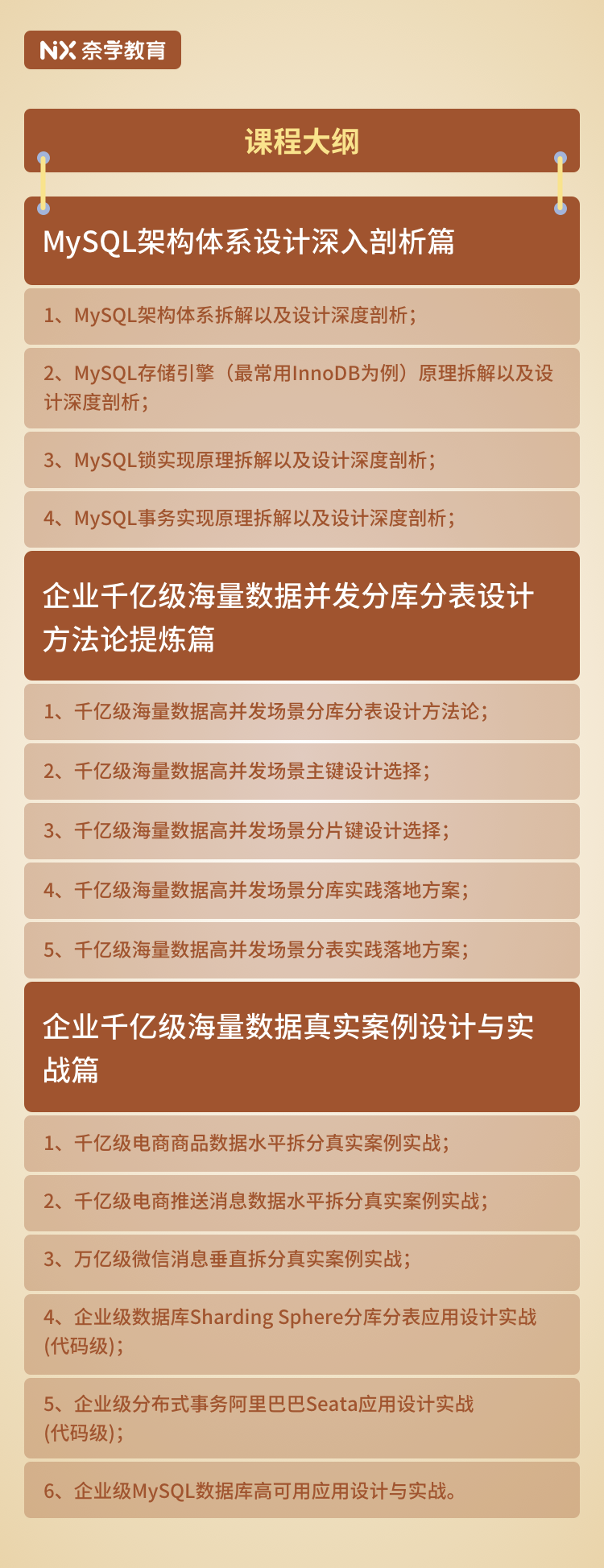 通过学习,你将精通包括MySQL架构设计深入剖析篇、千亿级企业海量数据分库分表方法论提炼篇、千亿级企业海量数据真实案例设计与实践等核心实战内容,通过通俗易懂的企业案例式讲解,带你真正掌握架构师级MySQL海量数据设计与实践,从而在成为优秀架构师的路上越走越快!