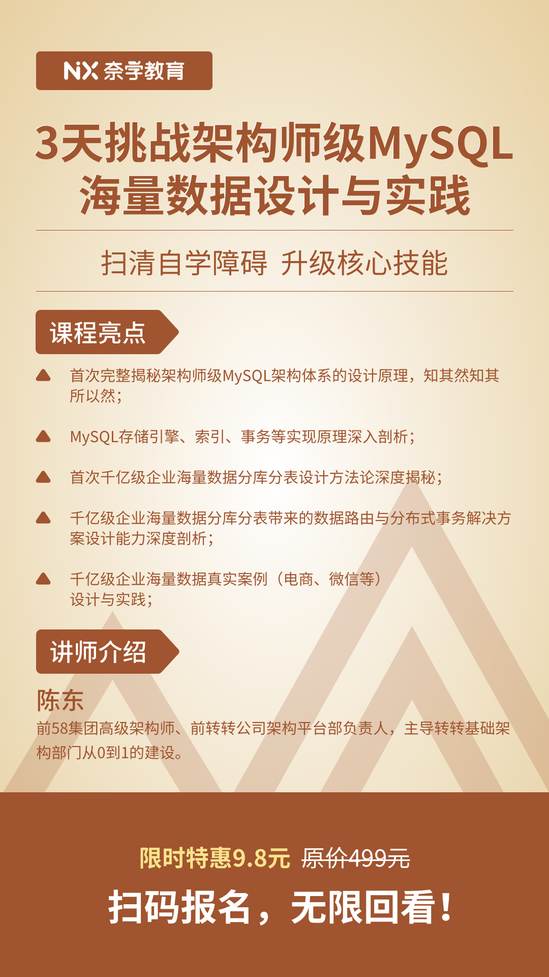 为帮助更多开发工程师、架构师掌握 MySQL 核心,前58技术委员会主席孙玄,联手58到家CTO沈剑老师,结合10多年一线大厂实践经验,最新打造了《3天挑战架构师级MySQL海量数据设计与实践 》在线专栏课。3天时间,名师将带你深入学习架构师级 MySQL,掌握核心架构技术,并在千亿级企业真实海量数据案例中(电商、微信等),培养你的 MySQL 实战能力。