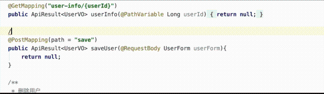 我们给 Controller 类和方法加上必要的注释,给接口方法返回相关的对象类型。是的,这样 JApiDocs 就能解析到相关的接口信息了,就跟我们平时写的代码是差不多的,但要注意,你要通过@param来告诉 JApiDocs 接口的参数,但在 IDE 的帮助下,这个工作将是轻松愉悦的: