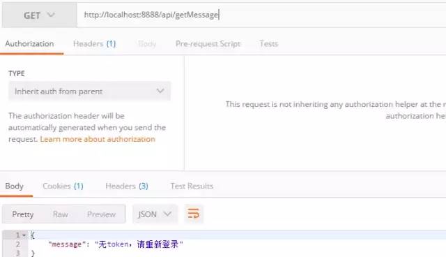 不加注解的话默认不验证,登录接口一般是不验证的。在getMessage()中我加上了登录注解,说明该接口必须登录获取token后,在请求头中加上token并通过验证才可以访问
