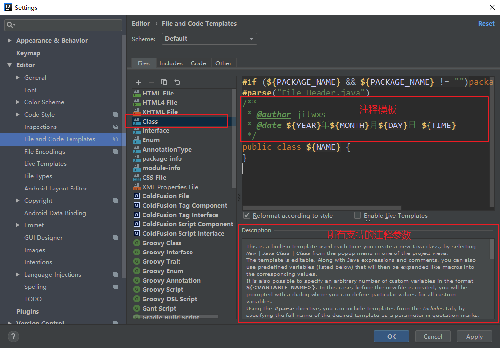 在我提供的示例模板中,说明了作者和时间,IDEA 支持的所有的模板参数在下方的 Description 中被列出来。